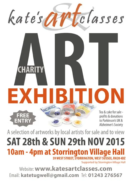Our first Art Exhibition was held on Saturday 28th & Sunday 29th 2015 at Storrington Village Hall, Storrington, West Sussex. The aim of the exhibition was to showcase the talented artwork of local artists in my classes and to raise money for Alzheimer's Society and Parkinson's UK.