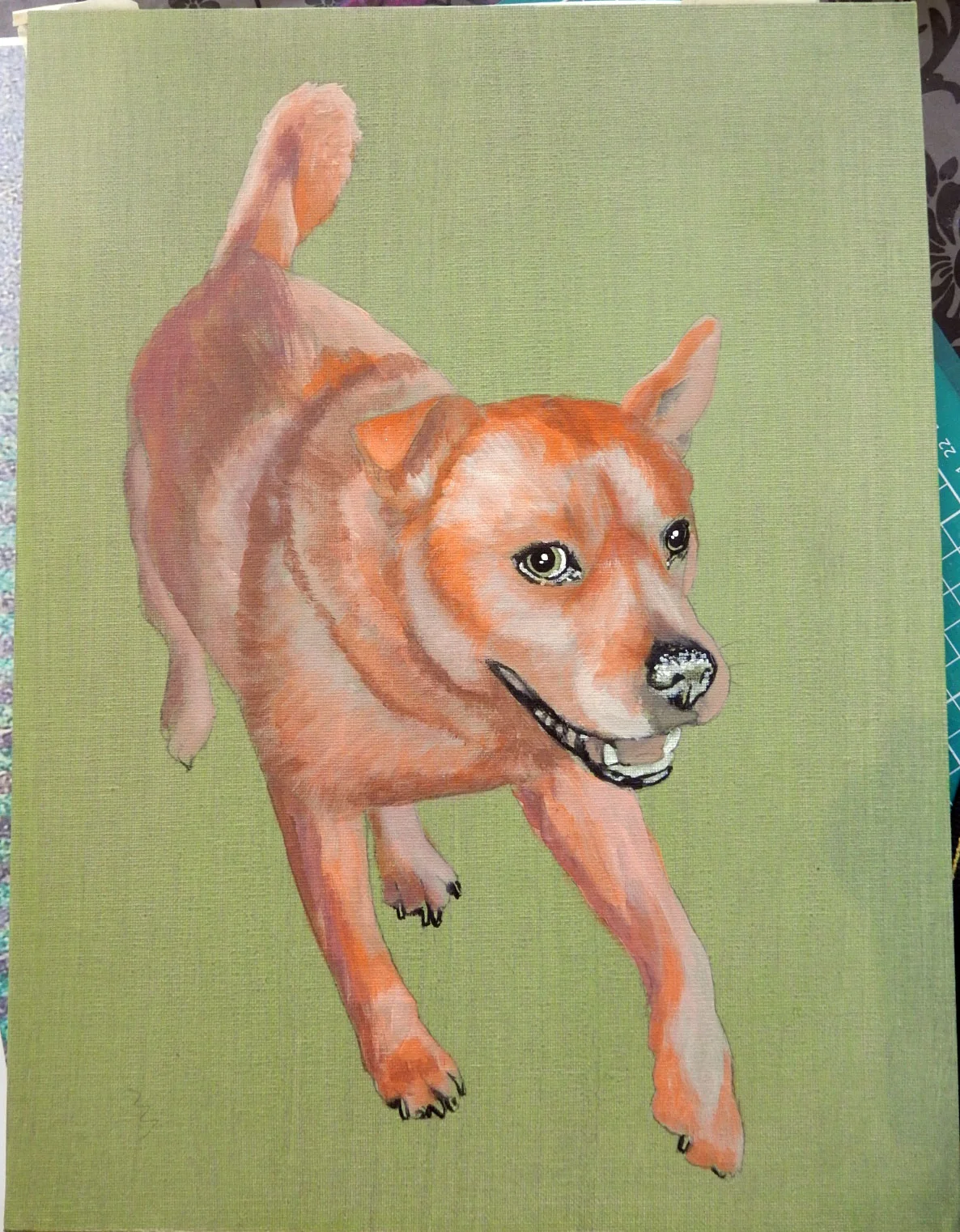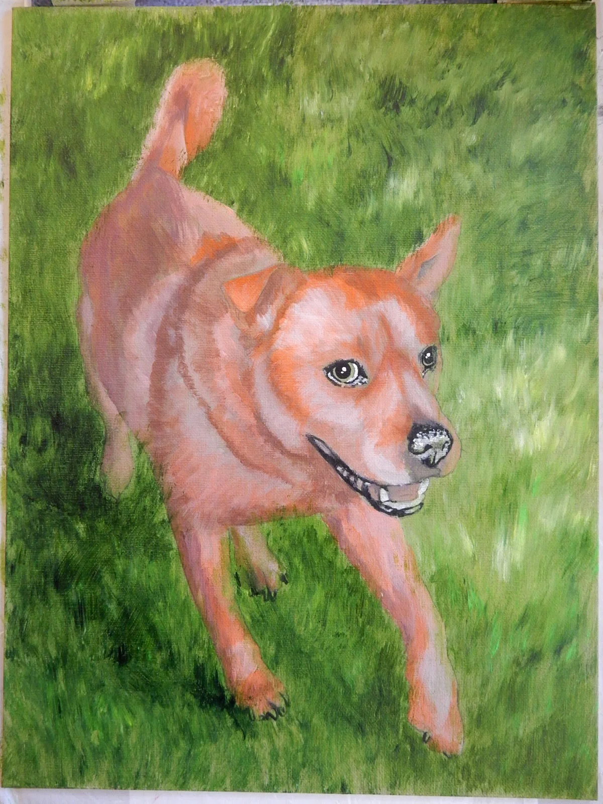 This 12 x 16" commission amalgamates a number of favourite photos of this cute little dog that races around with his right ear cocked. I started by painting a canvas board with sap green mixed with a bit of white and ochre to give me a mid-tone base to work from. When it was dry I sketched the outline and main features then painted the black and white parts of the eyes, nose and mouth to establish everything in its right place. I put down a base coat of orange, burnt sienna and white to create the shadows and highlights in Belushi's coat then got to work on the background. I started by roughly flicking in a variety of greens, browns, yellows and whites with an old bristly hog hair brush. This created texture and shadow areas en masse so I used a fine rigger to add small details of grass, stems and leaves. I sourced a few photos of meadows with daisies, decided on the light source and had fun painting the daisies. I have built up the coat with glazes of colour starting with yellows and browns and working around the spectrum finishing up with the whiskers, and Belushi is ready!