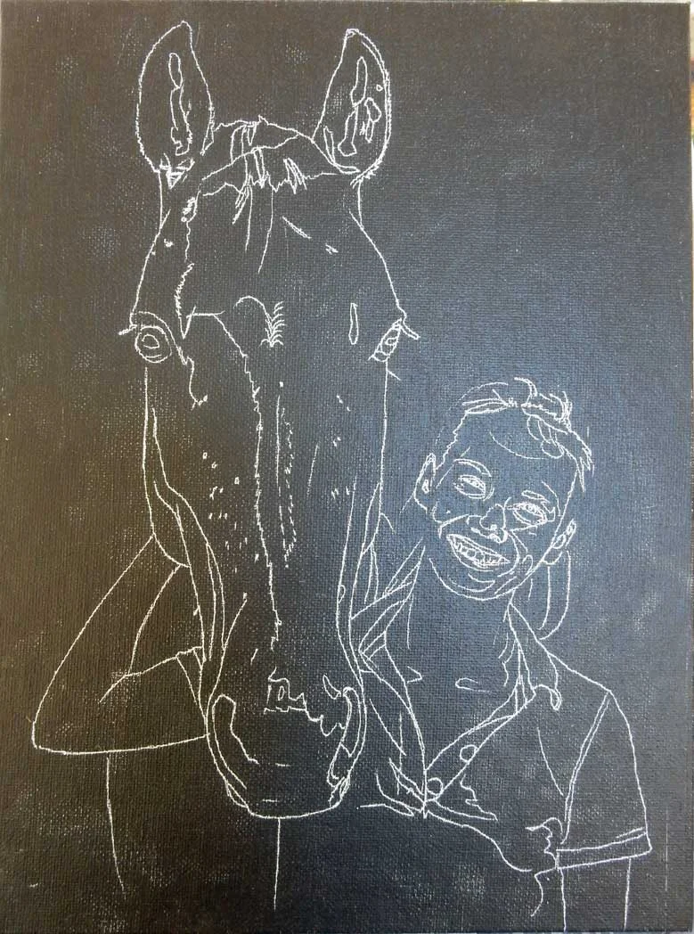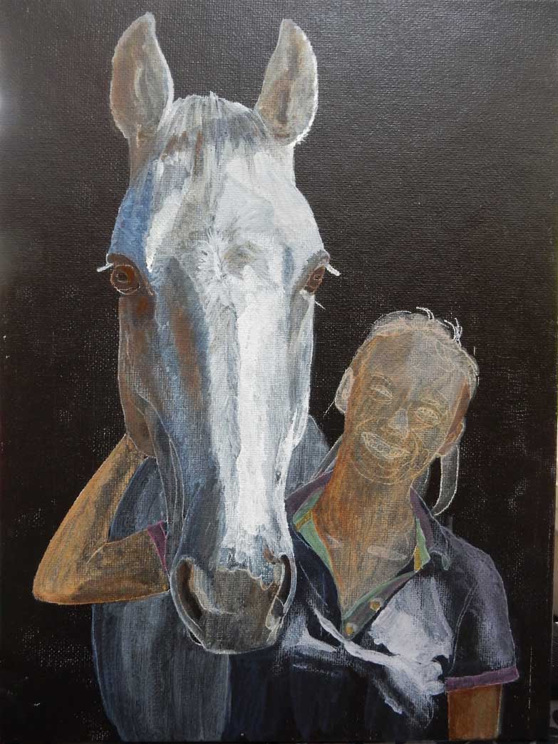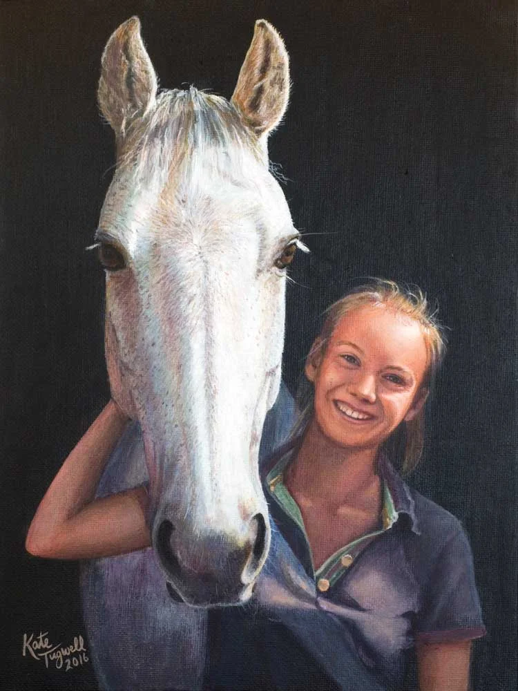 This latest commission is from a customer whose dog I painted years ago. They now want a portrait of their daughter with her horse, and one just of the horse for their daughter. I loved the photo they sent me of Charlotte and Annie so while waiting for the bigger canvas to arrive for the horse I started on the smaller painting which is 9x12" in acrylic. I painted the background a warm black and then drew the information I needed when the surface had dried. Next I started to block in the colours and main areas of light and dark. I chose a fairly small brush to start with as I didn't want to skew the details so the glazes have been built on little by little in order to build up the colour and lose the black - I wanted to make them 'appear' from the darkness. Then I worked more on the horse's head, adding details like freckles (if horses have freckles?!) and started to build glazes on Charlotte's face. I have kept going back and adding different glazes over the last few weeks, as I think I've finished it, and then when I look at it again, I've noticed something else. The last picture shows how I have softened the shadows a tiny fraction and warmed up Charlotte's hair a bit, plus I've changed her mouth shape a little, changed the tones on the horse and added a few more hairs to the horse's nose. Will I still find changes when I look again tomorrow....?!!