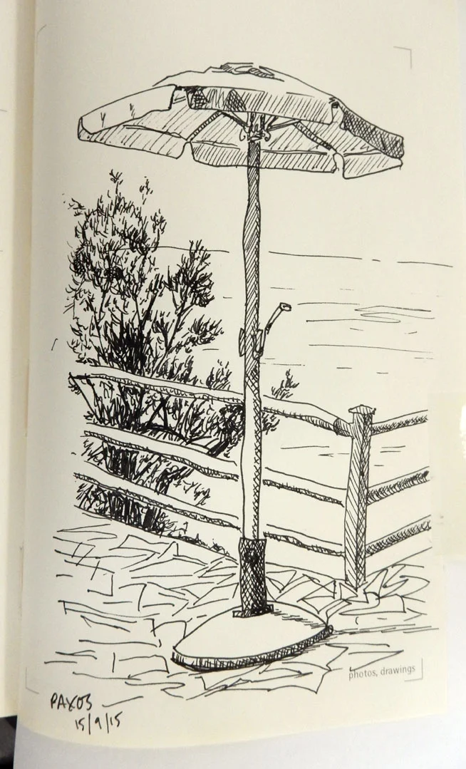 Whenever I go on holiday I always pack art materials - the biggest pad of paper my suitcase will take, some watercolours or pastels, drawing pens, pencils, a rubber, masking fluid, tape, a selection of brushes, you name it, I'll use up my baggage allowance with creative paraphernalia and if I'm not quite up to the limit I'll chuck a couple of art books in too for added inspiration. My confession is that I often return home with at least a third of my suitcase unworn and unread and the art materials untouched! However, this time, I decided rather than setting myself the onerous task of creating a finished masterpiece by lunchtime each day (preferably framed and packaged for shipping as well), I would just try to do a doodle each day - a quick sketch of a landscape, a detail in my surroundings, something quick, in pen & ink, just as my great-grandfather did on his travels. I have plenty of photos to inspire me now I am home but these are the doodles from my sketchbook and a flower I painted as a gift for our friends Ioanna and Antoniou in Greece as it was picked for me from their garden...