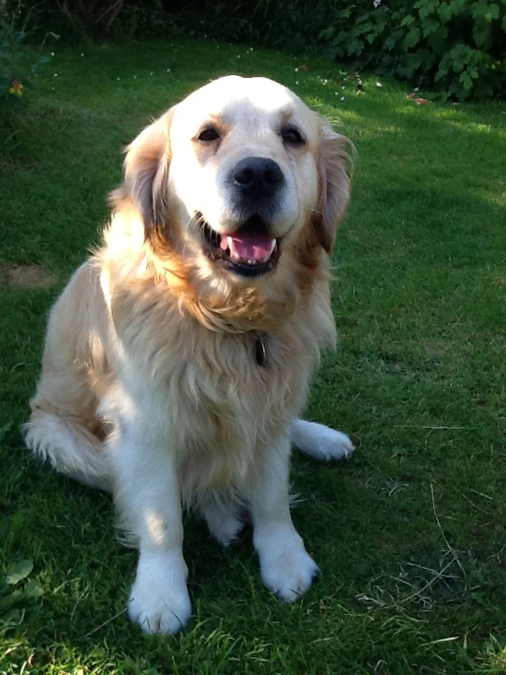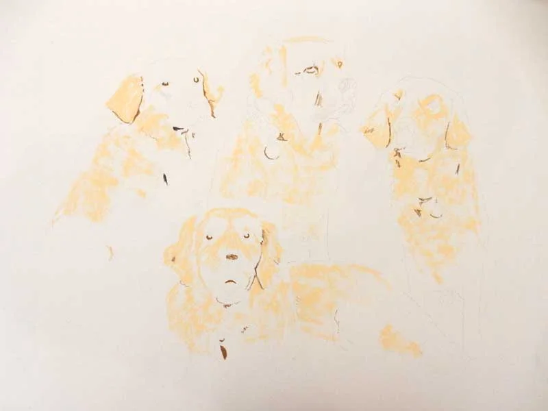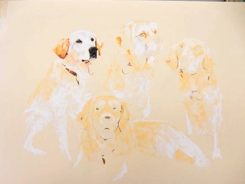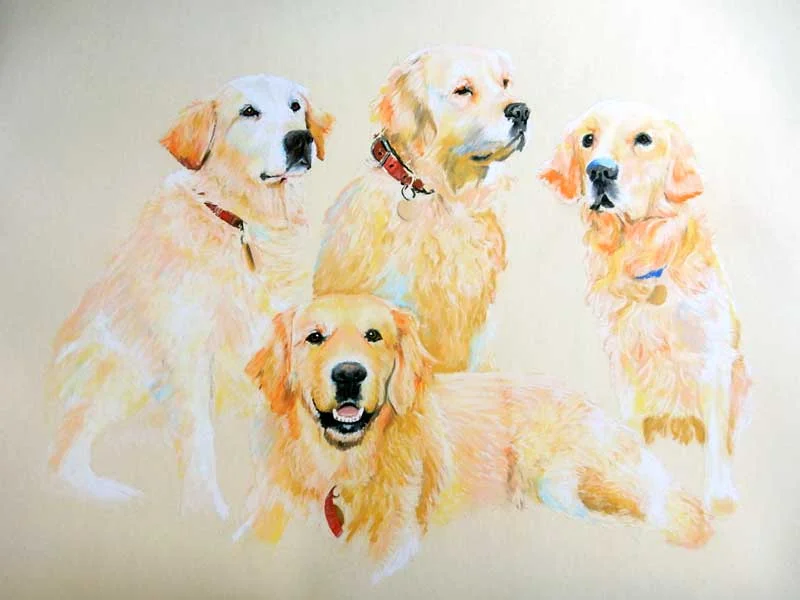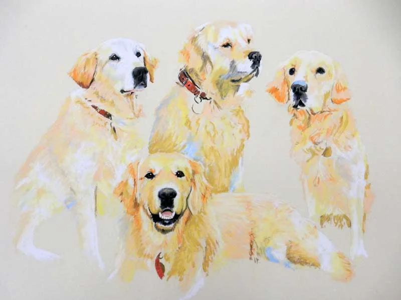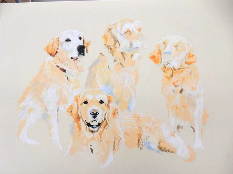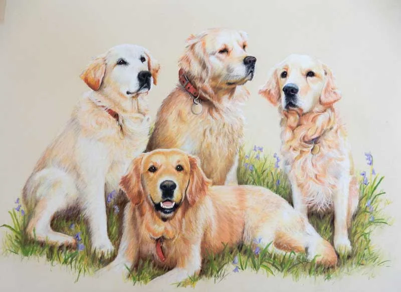 This latest challenge combines four different golden retrievers, taken on different occasions, with different light sources, into one big pastel portrait. To get the composition I scanned in all the photos and rearranged them in different poses and changed some of their heads for their favoured expressions. After narrowing down the arrangements to just a few that really worked, I let the owners choose their preferred composition and set about sketching the basic form onto Fisher 400 Pastel paper. This has a greater degree of tooth than most papers so I chose it because I know I can keep layering up the pastel and covering any mistakes! You can also paint the surface with watercolour or acrylic paint before you start as it only comes in two shades of cream. I decided not to do this to keep the hues quite subtle and I can always add colour into the background later on in the process. Once the dogs were roughly outlined, I marked in the darker shapes and features with a dark brown pencil to 'key-in' the main features. Then I blocked in some mid tones followed by highlights in white Conte pastels. Next I focused on Robbie's face to try to capture his character early on followed by Charlie's, using pencils to get the detail. I have decided not to blend any of the layers on this portrait but to keep the marks fresh and layer them up but I need to work on the dogs as a whole as well as paint them individually. In order to make the dogs look like they belong together, when I use a colour I try to see where I see that colour on the other dogs so peach, yellow ochre, grey, orange, brown grey and even blues were sketched in. Bluebells were a late addition after the grass was painted, to draw them all together and many more layers of colour added to their coats in order to achieve depth. Finally, the dogs were compared together by the owners to adjust the dogs' coats colour and tone... et voila!