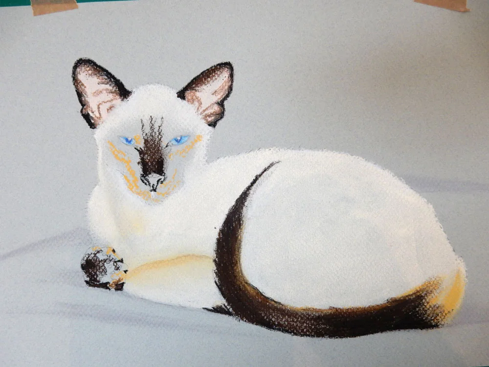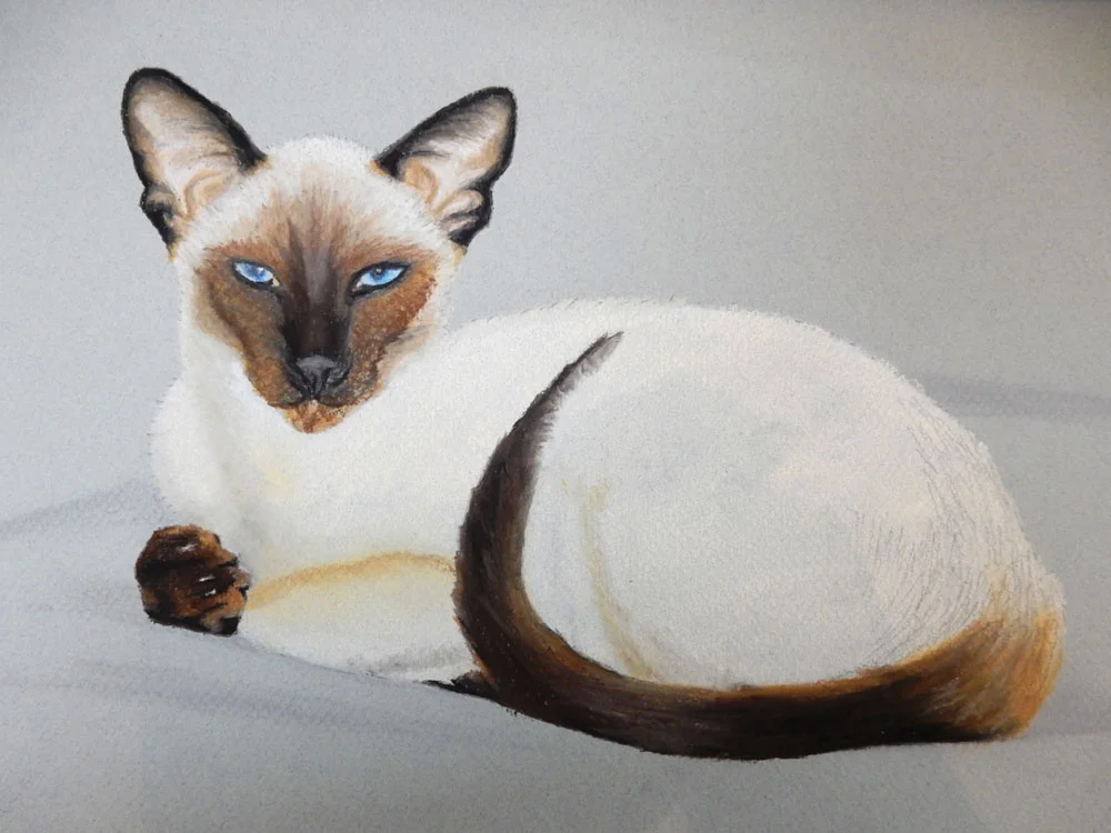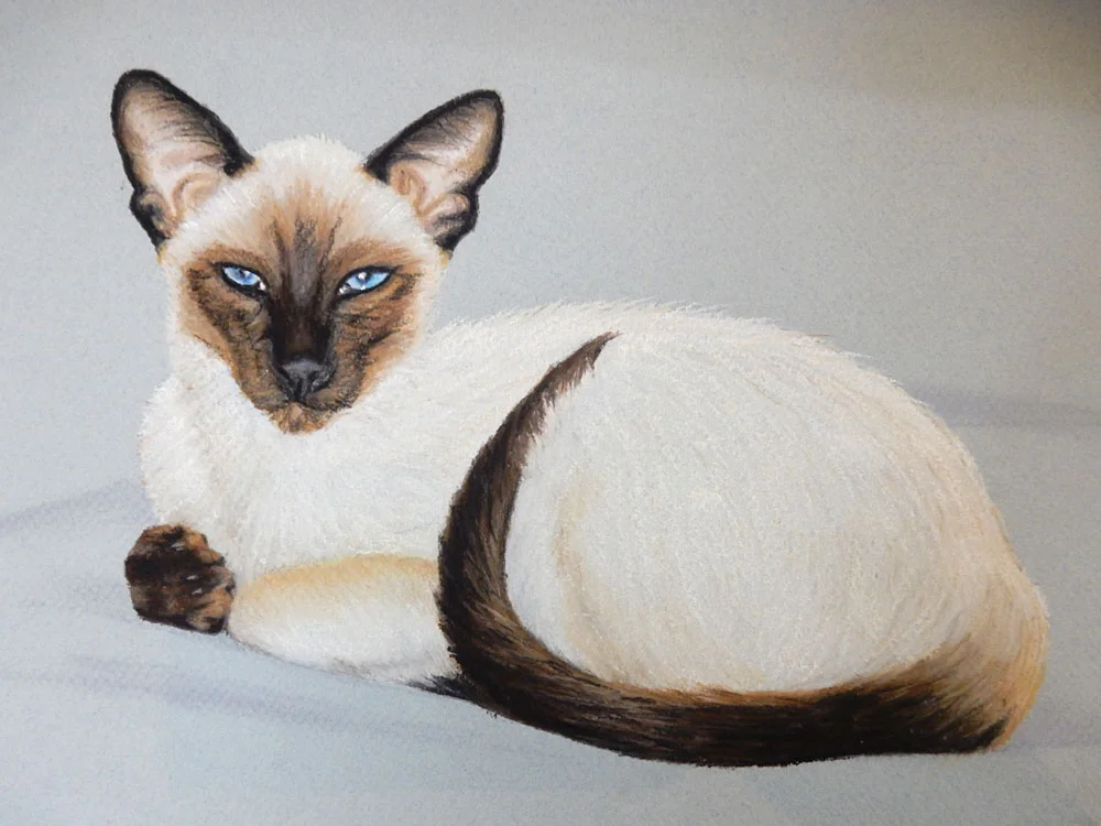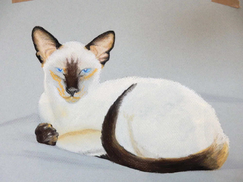 Another Christmas portrait from a past customer is being worked on in my studio. This is Saffy - a sleek Siamese with a wry smile. I chose a blue/grey midtone Murano pastel paper to sketch her onto before choosing the lighter tones to apply and blend as a base coat. Then I applied the darks and golden colours and pushed the pastel into the tooth of the paper which has a honeycomb texture if left unblended. Next I worked on the ears and the main part of the face adding in some subtle colours and tones. With these blended using a silicone tipped shaper I started work on the texture of the coat. I switched to pastel pencils as it's a relatively small A4 size portrait, and flicked in greys, creams, whites and yellows into the lighter areas. These were blended using the lighter pencils so the marks remain. I put some golden colours into the face and added some darks on top. Finally I have gone darker on the face as the other photos show her slightly older and this is how the owner wanted to remember her. I have also widened her eyes so you get transfixed by her blue stare and added whiskers!