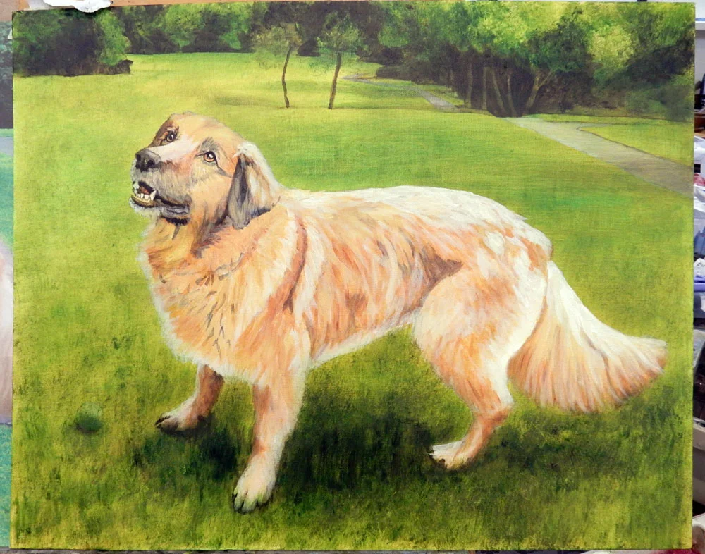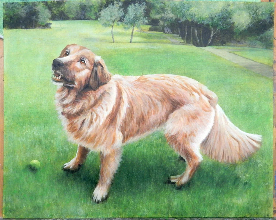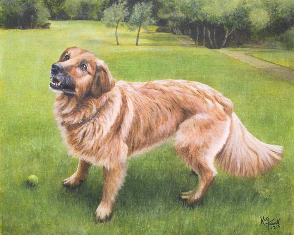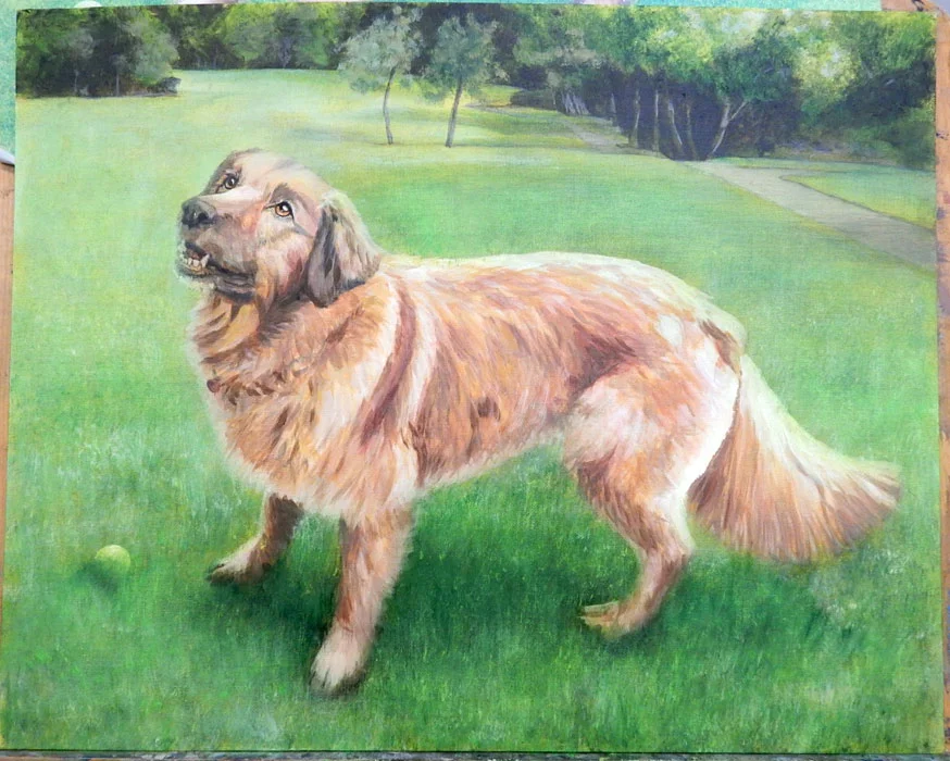 Since the last blog post I have been working on Poppy by painting in lots of glazes and layers of paint to create depth. The background and grass has had a variety of greens painted using various brushes for texture. Poppy's coat has had several layers of lights and darks added to her coat, finally working around the eyes and mouth with a finer brush. Poppy is now framed and ready to send for Christmas!